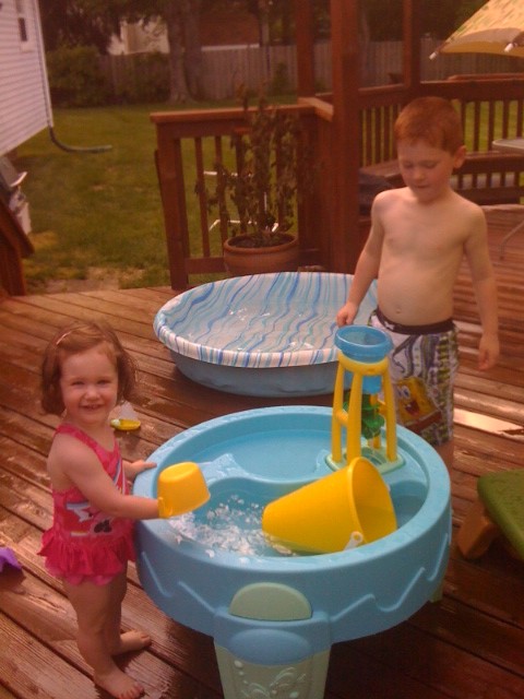 Thoughts of the weekend are keeping me smiling, though. Living at the Jersey Shore (which is not at all like the Snookified version you see on TV!) is a real crankiness crusher. We had dinner with another couple on Saturday at a fantastic restaurant on the water, which included actual adult conversation with a side of delicious food and a walk on the dock under the moonlight. The rest of the weekend included outdoorsy stuff: Lots of hamburger & hot dog-eating, wine drinking, and watching my giggly kids go from splashing around in their kiddie pool to darting through their crazy octopus sprinkler. Nothing makes me happier than being with family and friends, and spending time doing summer activities. And there’s so much to do around here! I can’t wait until we can hit the spray park, sit under an umbrella at the beach, take a walk along the Long Branch Pier, check out the amusement parks in our area, and then chill on the deck with a frozen strawberry margarita. That’s what I’m talking about! 😉