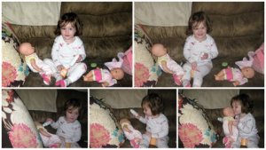 Yesterday, I beamed with pride as I watched my daughter Anna dote lovingly on her baby doll. As you can see from the selection of (adorable!) photos to the left, she was feeding and kissing her–but what you can’t see (or hear) is she how whispered sweet things into her baby’s ear and hummed while she covered her with a blanket while saying, “Nightie-night!”